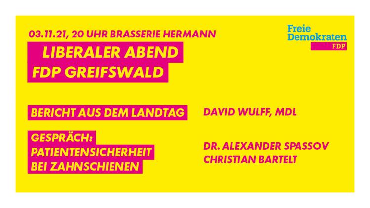 Über diese Themen wollen wir gemeinsam mit euch diskutieren. Gerne sind auch eigene Einwürfe gesehen. Der liberale Abend findet wie gewohnt am 03.11.21 um 20 Uhr in der Brasserie Hermann in Greifswald statt. Wir freuen uns auf eure Teilnahme!